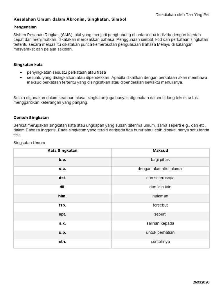 . Berikut merupakan senarai akronim kependekan atau singkatan yang sering dijumpai dalam bahasa Melayu serta dalam bahasa. Periksa terjemahan Singkatan kata ke dalam Bahasa Melayu. Namun penggunaan angka sahaja turut digunakan seperti 2 yang bermaksud tu.